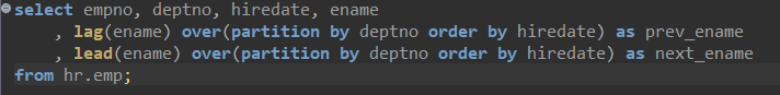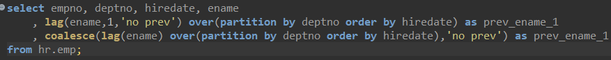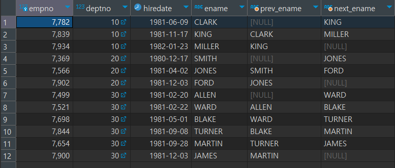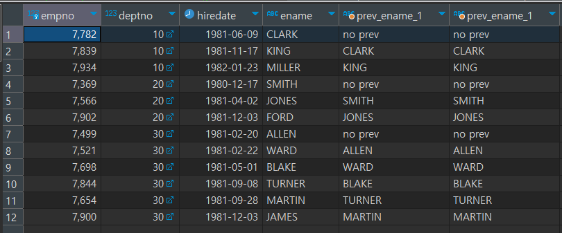 lag() 함수를 통해 생성된 prev_ename 컬럼을 보면 ename 컬럼에서 본인 이전의 행 값을 가져와 출력하는 것을 알 수 있음. 이전의 행 값이 없는 경우 NULL