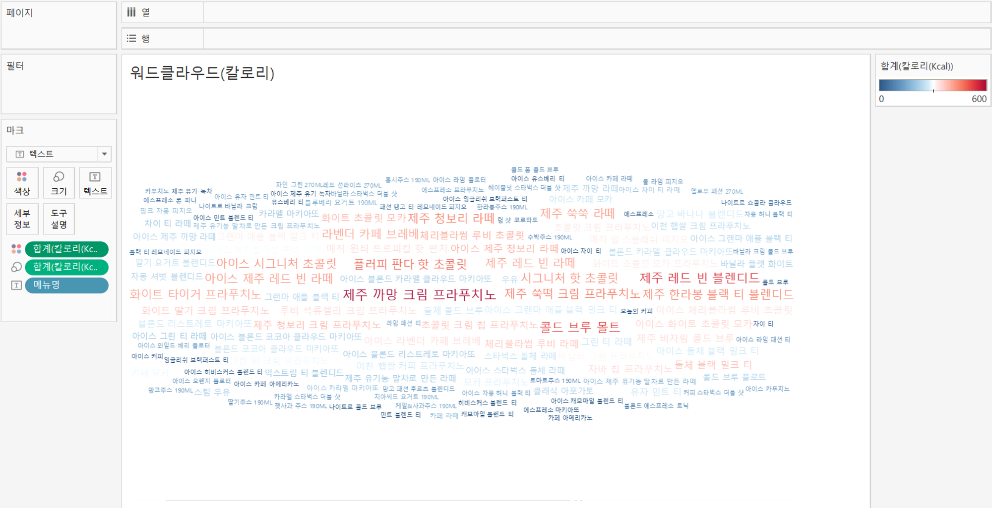 메뉴명 워드클라우드(크기 : 칼로리, 색상 : 카페인)