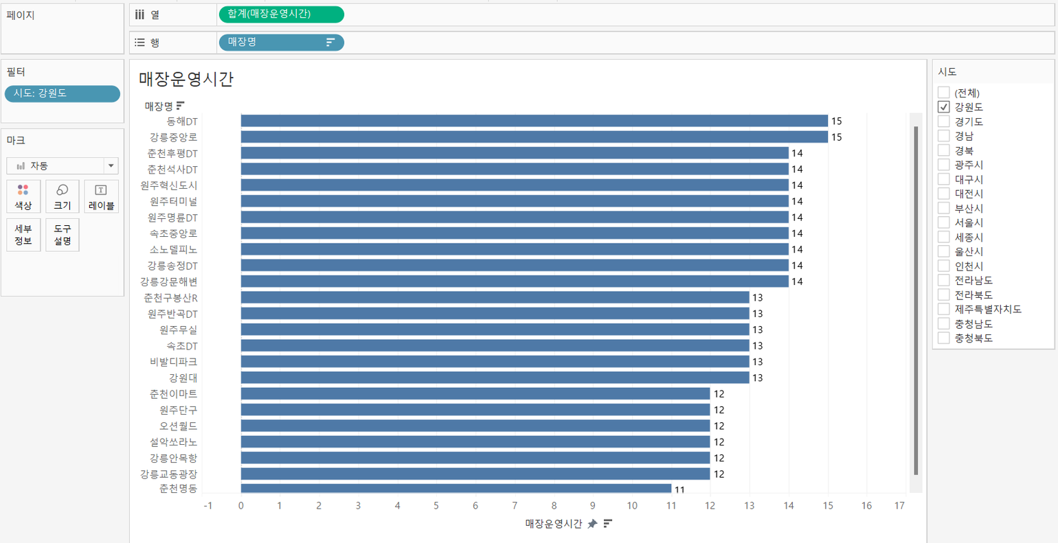‘매장명’별로 ‘매장운영시간’을 표현하고, 시도를 필터로 걸어 각 시도의 매장 별 운영 시간을 확인하는 시각화