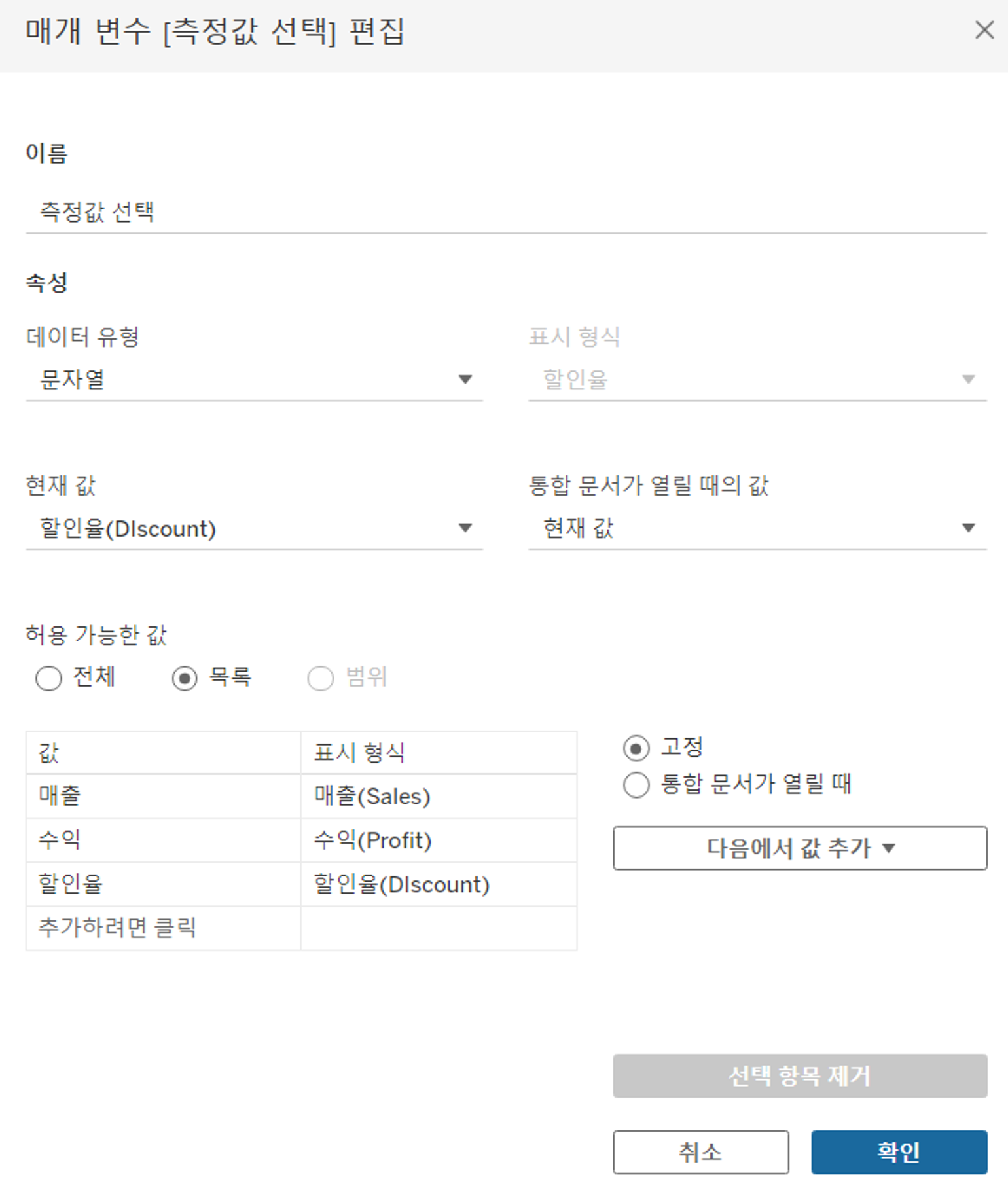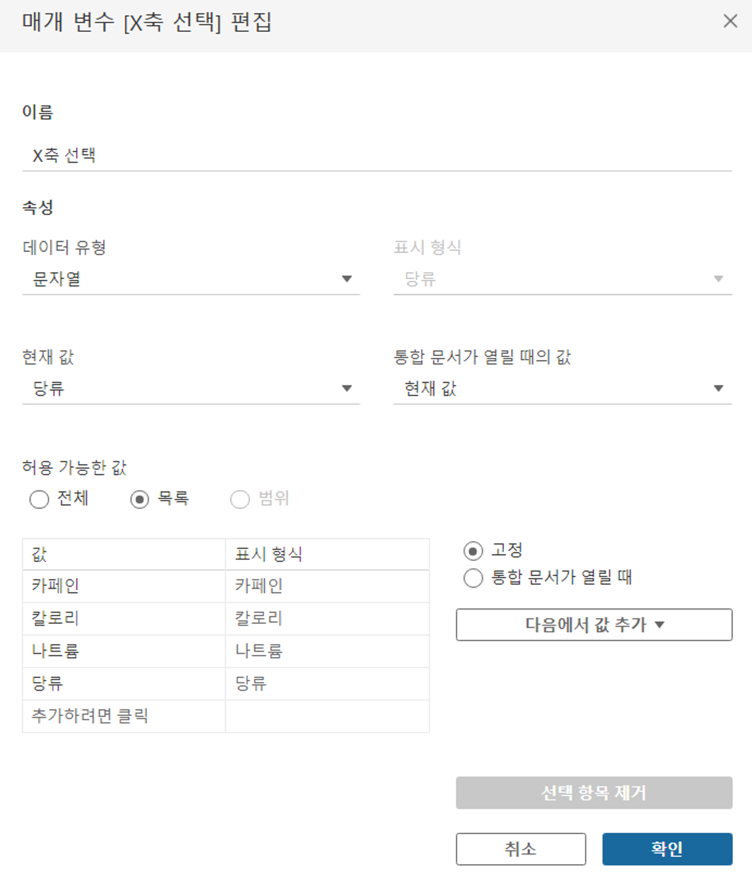 계산, 필터 및 참조선에서 상수 값을 동적으로 바꿀 수 있는 변수