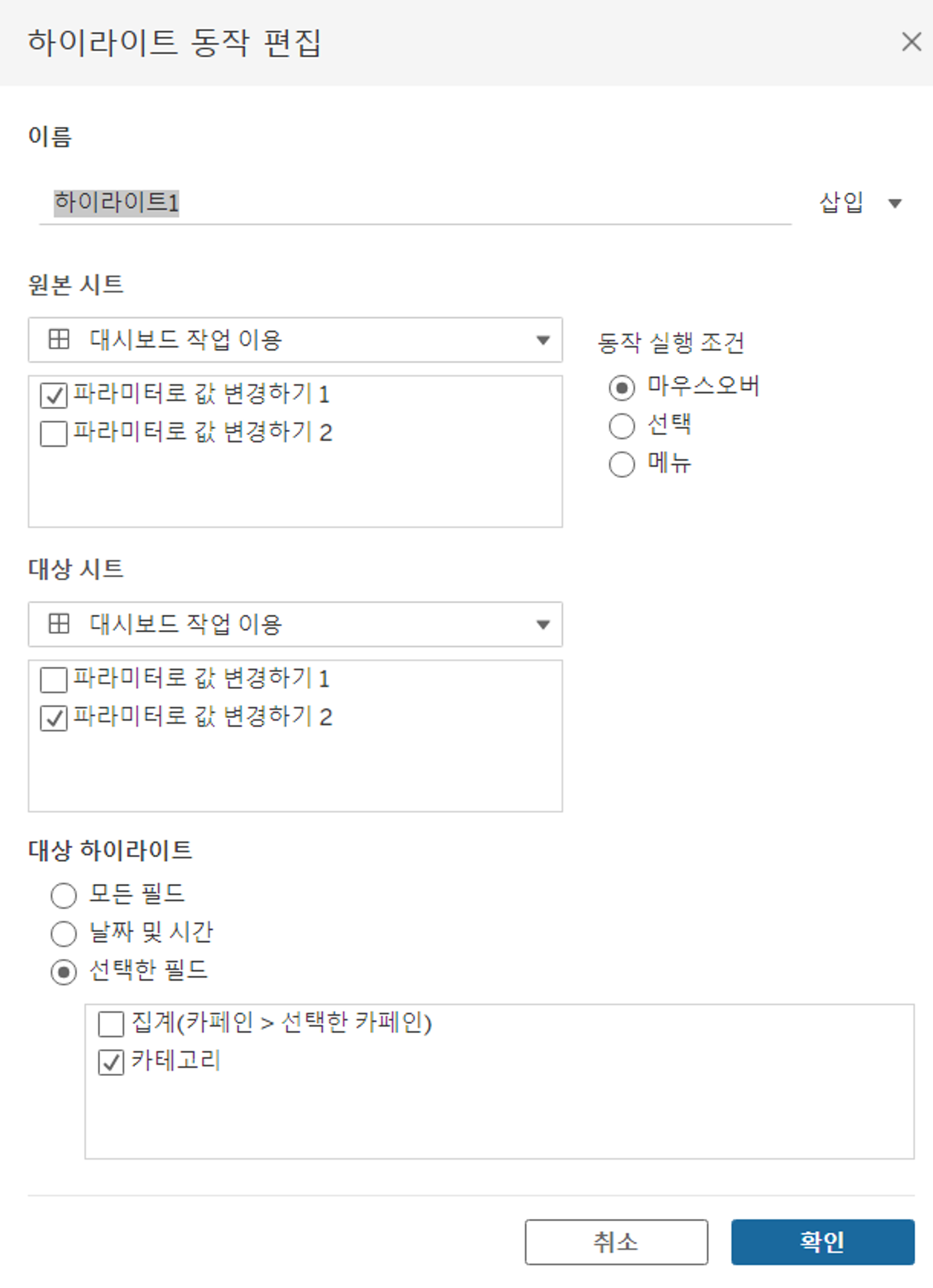 메뉴 > 대시보드 > 동작 > 동작 추가 > 하이라이트 선택
