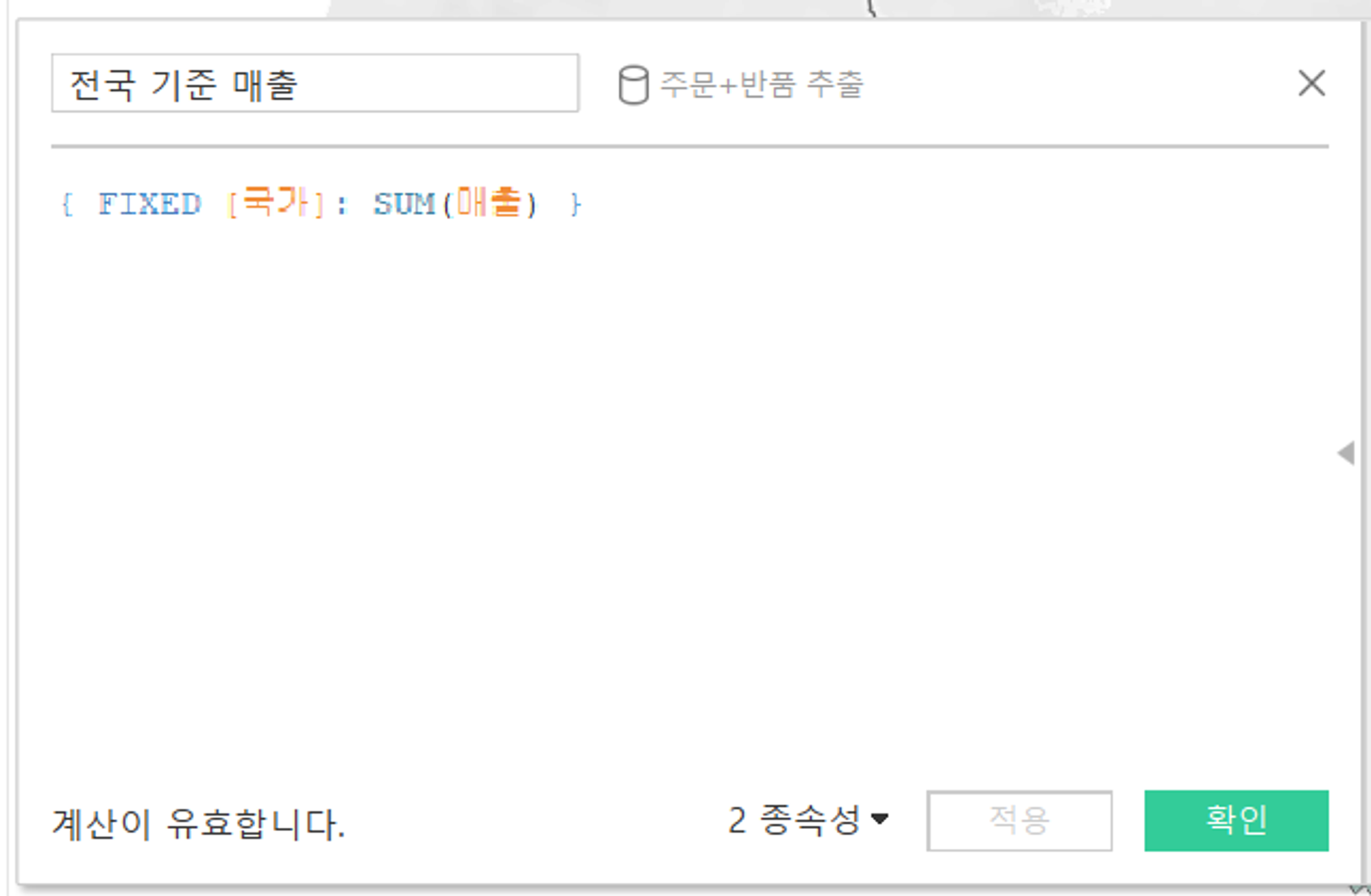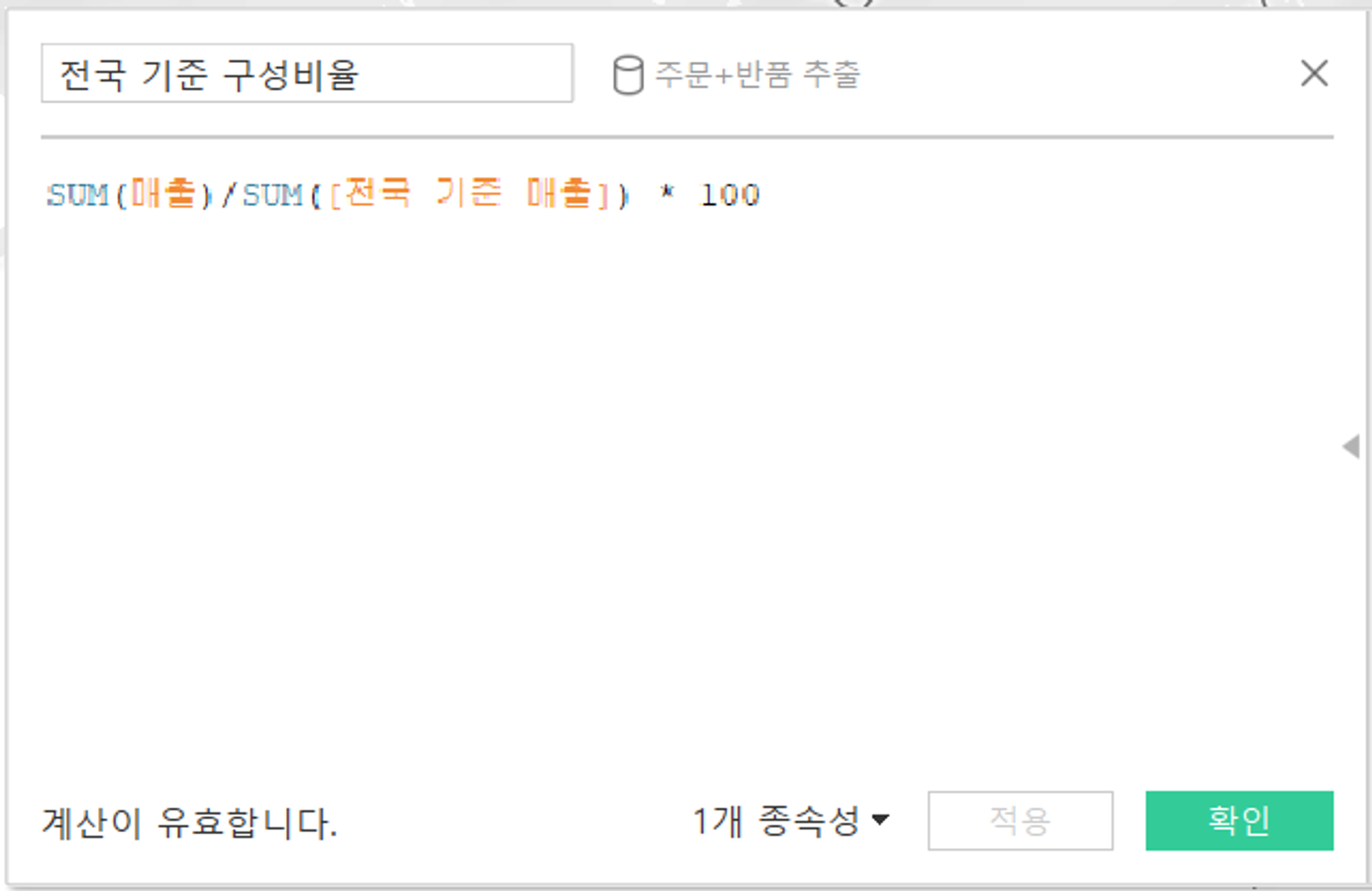 3. 세부수준 계산식(LOD) : 전국 기준 매출 구성비율 구하기