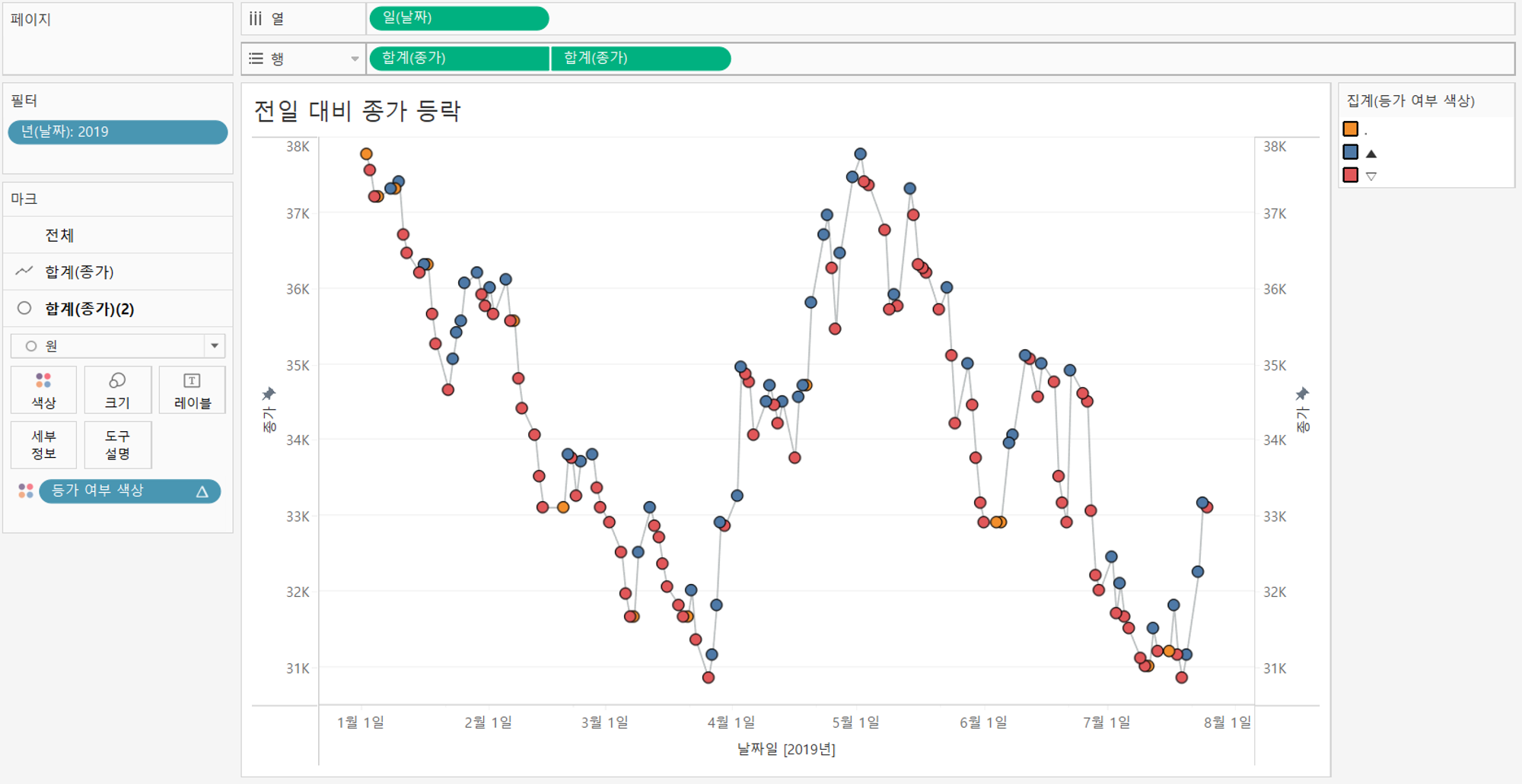 종가를 하나는 라인, 하나는 원으로 나타내고 이중축을 사용하여 합침