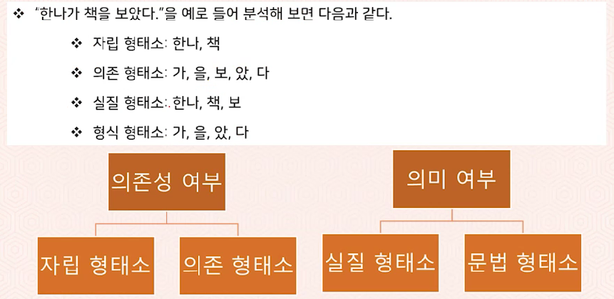 형태소는 그것이 가지는 의미 또는 기능에 따라 크게 문법형태소와 어휘형태소로 나누어짐